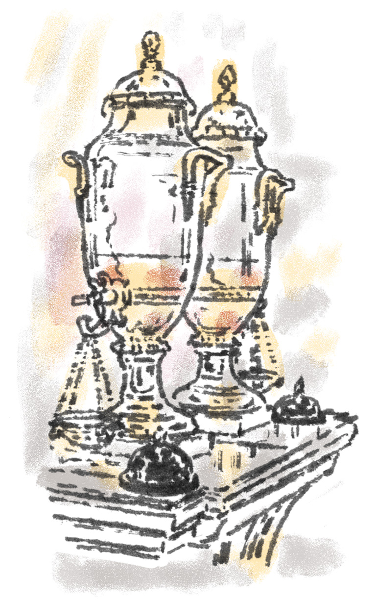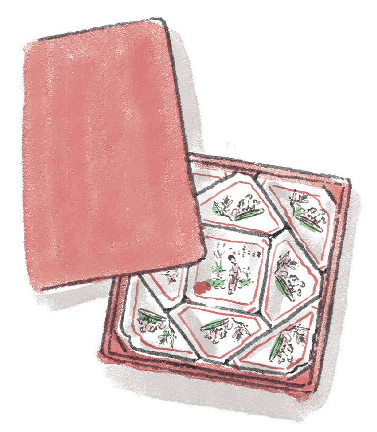 時代に埋もれていた品物にもう一度活躍してほしいので、購入するのはすべて実際に使える食器ばかり。9枚の皿がお盆に収められたセットは、華やかな茶会の主役としてお出しします。あまり散財をするほうではないのだけれど、想像の翼を広げてくれる骨董品だけは、止めることができない人生の楽しみになっているんです。