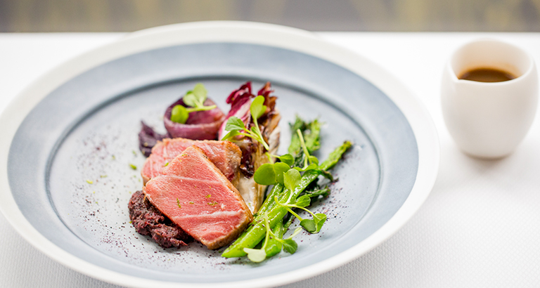 総料理⻑の⼩島景シェフ⾃ら市場で買い付けている新鮮で⾵味豊かな鎌倉野菜は、このレストランの代名詞。加えて、厳選した旬の⿂介類や⽥中久⼯⽒の神⼾⽜、茨城の梅⼭豚などのほか、フランスからのオマールブルーやフォアグラといった⾷材を使⽤。ワインのラインナップは、ボルドーやブルゴーニュ、シャブリなどの有名ワインをはじめ、約400種を揃えている。素材の持ち味を最⼤限に引き出したシンプルで繊細な味わいに、ワインとのペアリングの楽しみも広がりそうだ。