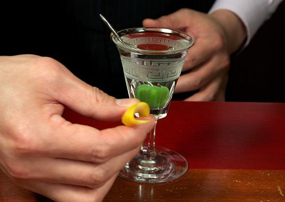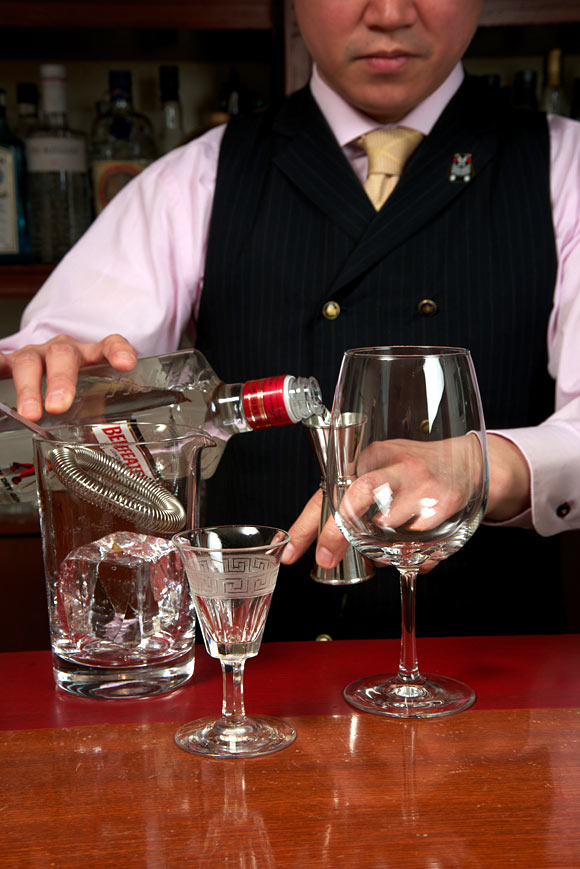 須田さんのマティーニは、ジンはビーフィーターのドライとウエットを合わせている。ヴェルモットはドラン・シャンベリー。