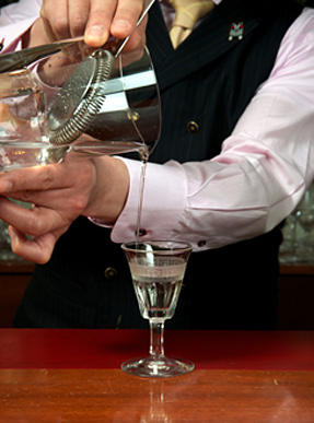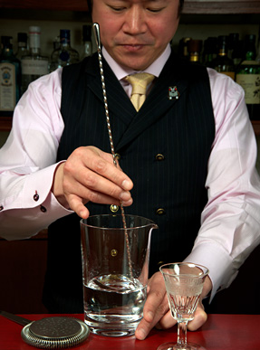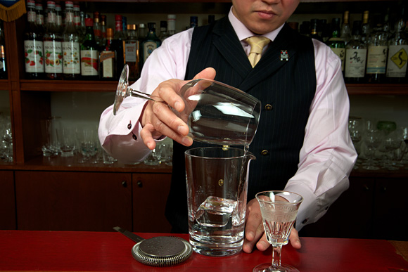 この液体を、大きな氷がひとつ入ったミキシング・グラスにとろりとろりと注ぎ、ゆっくりやさしくステア。