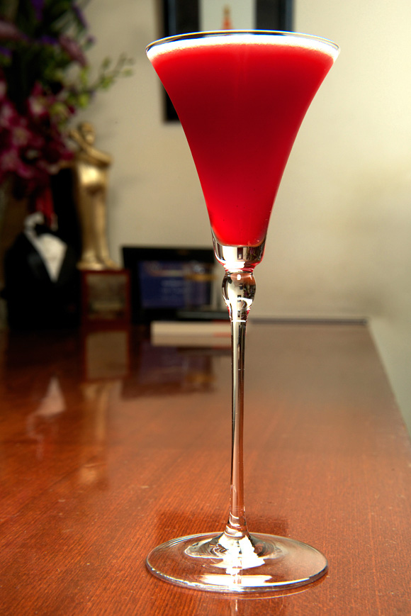 これらをシェイク。美しい紅色のカクテルが出来あがる。