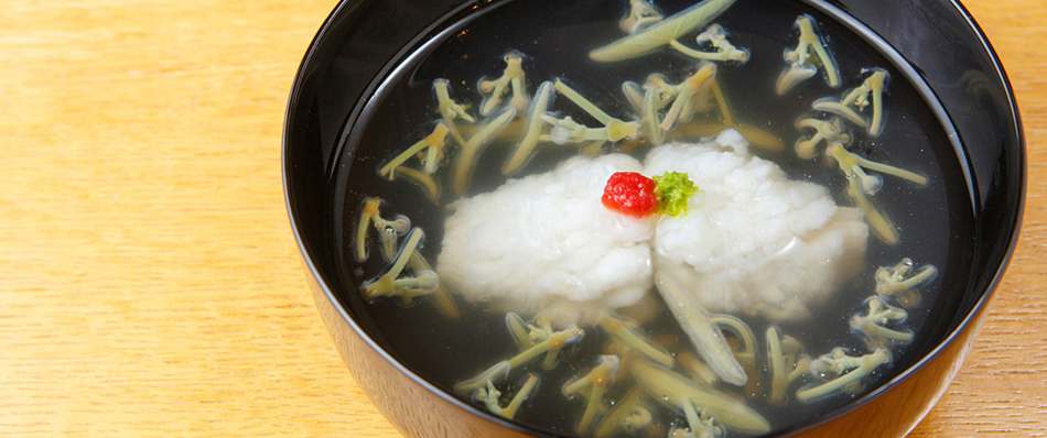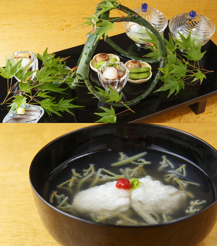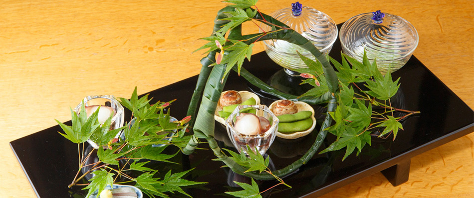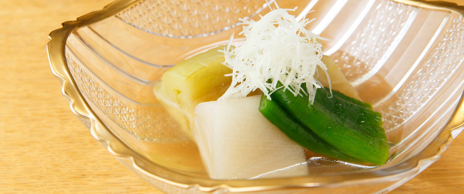 京都「桜田」での修業時代、松木さんは先輩たちの繊細な仕事に感動したと言います。「器、しつらえ、盛り付けなどお客様の目に見えるところはもちろん、見えないところにまですべてにおいて丁寧で繊細。出汁を取る際の昆布の長さまで一つひとつきちんと測るんです。和食の本場の心意気を感じた8年でした」。その料理やもてなしへの真摯な姿勢を松木さんは学び取り、現在の店でも大切にしています。したがって、要となる素材選びは自身で。毎朝市場へ足を運び、その日のお客の姿を思い浮かべながら素材を見極めます。下準備や火の通し加減など一つひとつの工程を大事にした品々は、季節感豊かに盛り付けられます。お店を訪ねたのはちょうど6月。八寸の皿には夏越祓にちなんだ茅の輪があしらわれ、さらに添えられた青もみじが生命の息吹を感じさせる演出。また、冷やし炊き合わせの一品は、賀茂なすと万願寺とうがらし、珍しい白ずいきをあっさりとした出汁で合わせ、すっきりと冷やし、彩りも鮮やかに供されます。