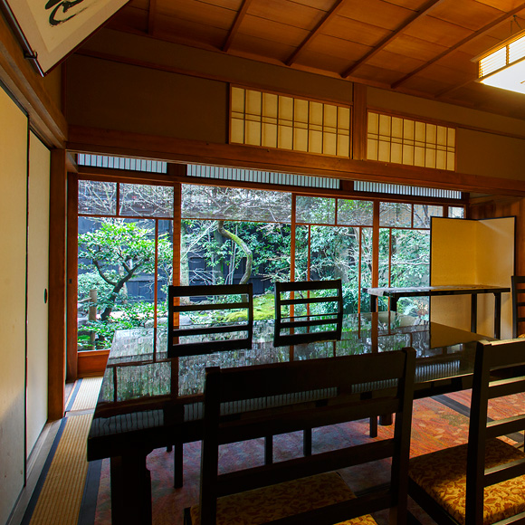 この屋敷は大正期に建てられたもので、明治から大正にかけて活躍した四条派の日本画家・今尾景年の元邸宅。国の重要文化財に指定されており、今では稀少となった屋久杉の梁や柱、景色に独特の歪みを与える窓ガラスなど、建築の隅々より感じる風情からは、繊細な筆致で知られた景年の画風ともどこか通ずる品格を感じます。