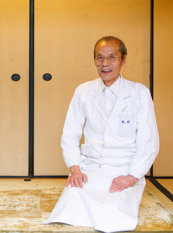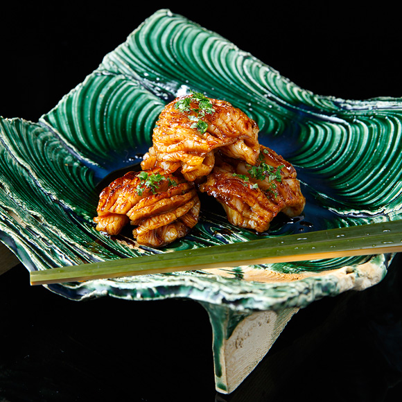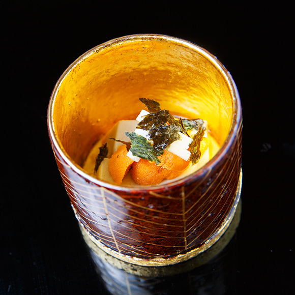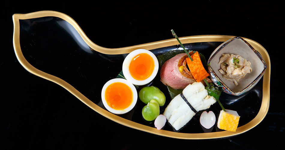 大正10年(1921年)、祇園で料亭として暖簾を揚げた『懐石 瓢樹』。昭和7年(1932年)、東山三条に移転したのちは仕出し店として、数多のお茶屋や寺院に料理を提供してきました。その後、縁あって現在の屋敷と出合った3代目主人・西村誠さんは、平成13年(2001年)にこの地で再び料亭を開店。ここでは、訪れる人の視覚・味覚の両方に訴えかける料理が供されます。店名にちなんだ瓢箪の盆に盛られるのは、目にも鮮やかな八寸。名物「半熟たまご」のほか、「めいもと芹の胡麻和え」の小鉢や、板うに、青唐辛子、いかの黄身焼きを刺した青竹の串など、季節の食材を生かした一品が繊細に盛りつけられます。「食材が持つ美味しさを邪魔しないよう、味付けは必要な分だけ、そっと」という信念の下に生み出される料理は、無駄を極限まで削ぎ落とした、洗練された味わいです。