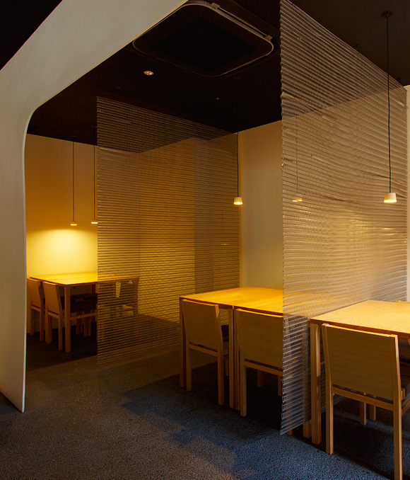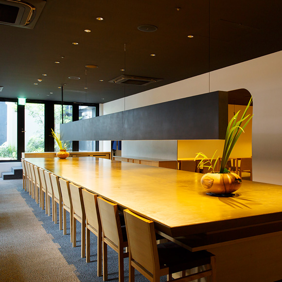 『ルイ・ヴィトン 大丸京都店』などを手がけたことで知られる建築家・永山祐子氏によるデザインで、漆喰の白壁を現代風にアレンジした仕切りが印象的。テーブルを優しく照らすペンダントライトを覆うのは、磁器作家・イイホシユミコ氏によるオリジナルの磁器シェード。磁器から透けるやわらかなオレンジの灯りが、モダンな佇まいの中に温もりを添えています。