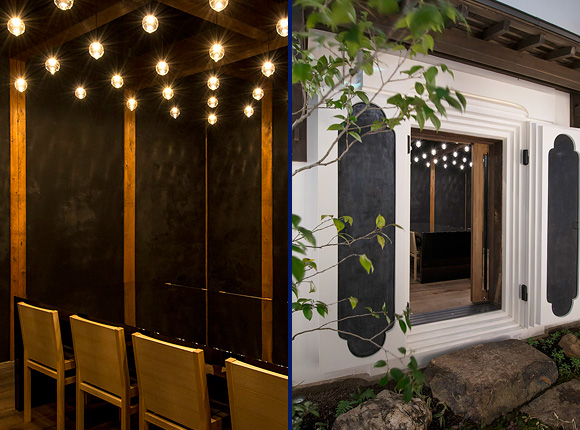 もうひとつ注目したい空間は明治時代築の古い蔵を生かした離れ。完全個室(8席)として使うことができ、ここへはまるで茶室へのアプローチのように、京の銘石とされる八瀬真黒石(やせまぐろいし)・鞍馬石などの加茂七石を使った庭石を伝って向かいます。外観や梁はそのままに、リノベーションされた一室です。天井には倉敷の職人による64個の吹きガラスの照明が。星空のように輝く幻想的な明かりの下、日常から離れた静謐な時が過ごせます。プライベートなお食事はもちろん、大切な商談の場としても重宝しそうです。