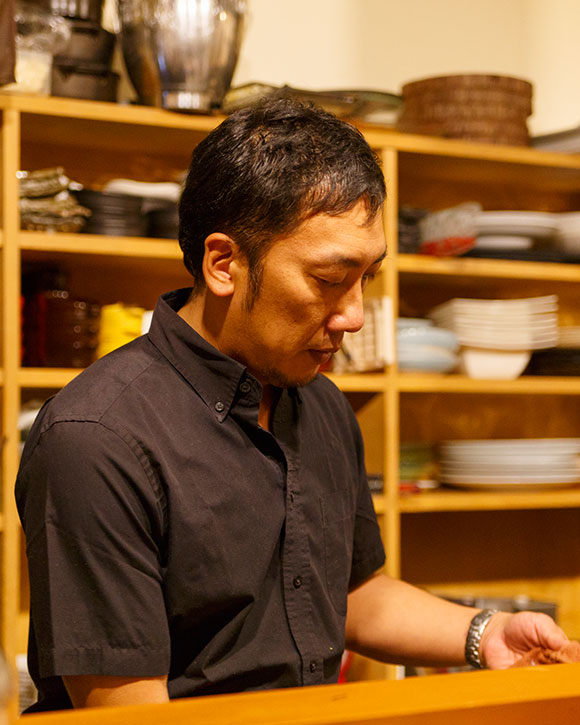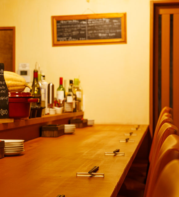 生成色の麻のれんをくぐると、1階には京町家特有の「鰻の寝床」を思わせる奥行きの長い空間に8席のカウンター席。傍らには2人掛けのテーブル2つのみ。「軽く一杯飲む感覚で立ち寄れる店を」というオーナーシェフ・村上章氏の思いから生まれた、カウンターを中心にした空間です。2階は、梁を残した天井の高い空間でテーブル席が並びます。