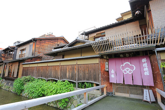 多くのお茶屋が立ち並んでいた祇園東は戦時中、空襲対策のため白川の北側にあった建物は取り壊され更地となった。現在は古都の風情漂う町に復興したが、江戸時代から栄えた往時の趣を残すのは、『白梅』が立つせせらぎの南側だけだ。
