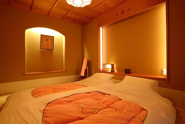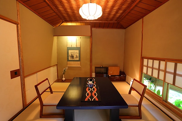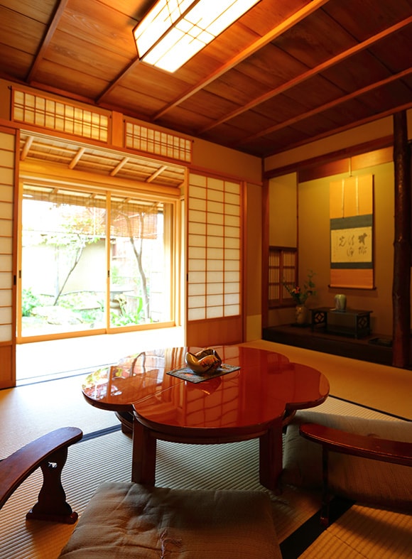 かつて舞妓が住んでいた置屋を改装して作られた「梅暦」は、女将曰く「一番祇園ぽい部屋」。障子越しに川の流れを眺めることができ、春は花筏、冬は雪と、白川の四季の移ろいが楽しめる。約150年の間変わらず客を迎える床柱は桜だ。ほかにも杉や松、梅、栗など、館全体では35種類ほどの木材が使われている。