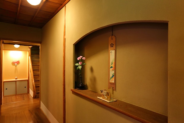 幕末から明治初期にかけて建てられたという数寄屋造りの建屋は、天井が低く廊下の幅も狭い。しかし、年を重ねた木の柱や梁に囲まれた旧お茶屋の空間に閉塞感はなく、むしろ包まれるような安らぎを感じる。明治・昭和と二度の増築・改修を行ったことで、廊下は何度も曲がる構造になっている。次の角を曲がればどこへ……と、つい探検しているような気分になる。廊下には慎ましく季節の花が生けられていたり、坪庭が望めたりと、館内散策もまた楽しい。