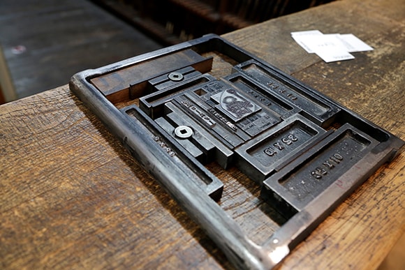 「馬の背」と呼ばれる棚に並べられたたくさんの活字。活字が落ちないように、少し傾斜がついてるそうです。