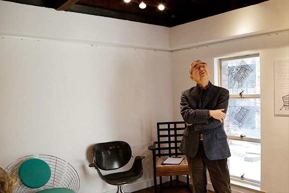 建物すべてがギャラリー。築85年の歴史を物語る、剥き出しの杉天井をじっくりと眺めます(左)。