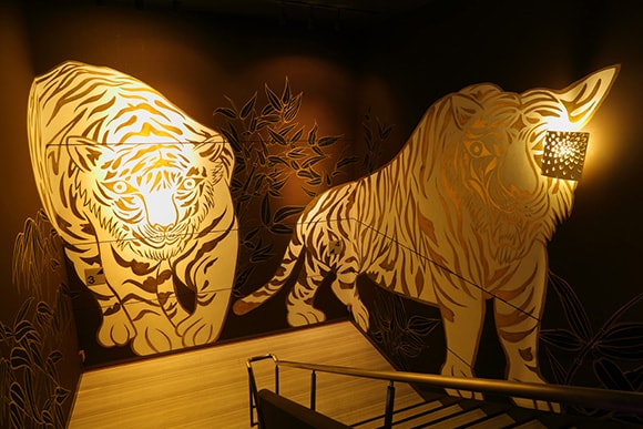 滞在時にはぜひ3階から4階へと繋がる階段を利用してほしい。なぜなら踊り場の壁には、圧倒的な存在感を放つ2頭の白虎が描かれているからだ。これは、青蓮院門跡の襖絵や関西国際空港の壁画でも知られる絵師・木村英輝氏の作品。廊下の紅葉や1階エレベーターホールの蝶なども同じく木村氏の筆で、今をときめくアートを間近に鑑賞することができる。