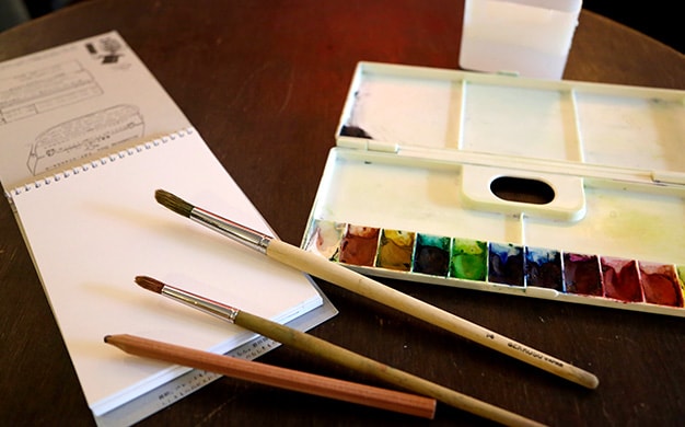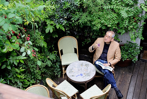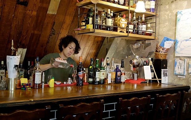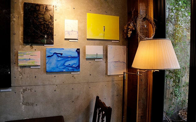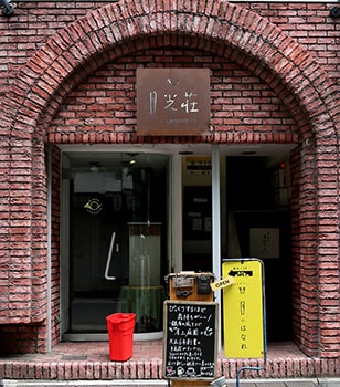 まずは画材店の『月光荘』に赴き、この近くの見番通りにあるという『月のはなれ』の場所を聞いた。分かりにくいですよ、とお店の人が言った訳はすぐにわかった。この辺りはバーやクラブなどが入るビルが立ち並ぶ、昔の銀座の姿を残しているエリアだ。かつて『月光荘』が倉庫にしていたところを店舗に改装したという『月のはなれ』はそんなエレベーターもないビルのペントハウスに位置していた。古いビルのご多分に洩れず急峻な階段を登り切ったところに別世界が開ける。