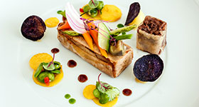 その王道ぶりの一端は、夏に人気を集める冷製スープ「パリの夕暮れ」のコールコンソメの澄んだ深い味わいからもうかがい知ることができる。またシャンパンやワインは、長年親交のあるランスやブルゴーニュの生産者から、井上氏自らが買い付けたものが中心。川面をそよぐ夜風を感じながら、グラス片手に京焼の器で供される正統派フレンチをじっくり堪能したい。