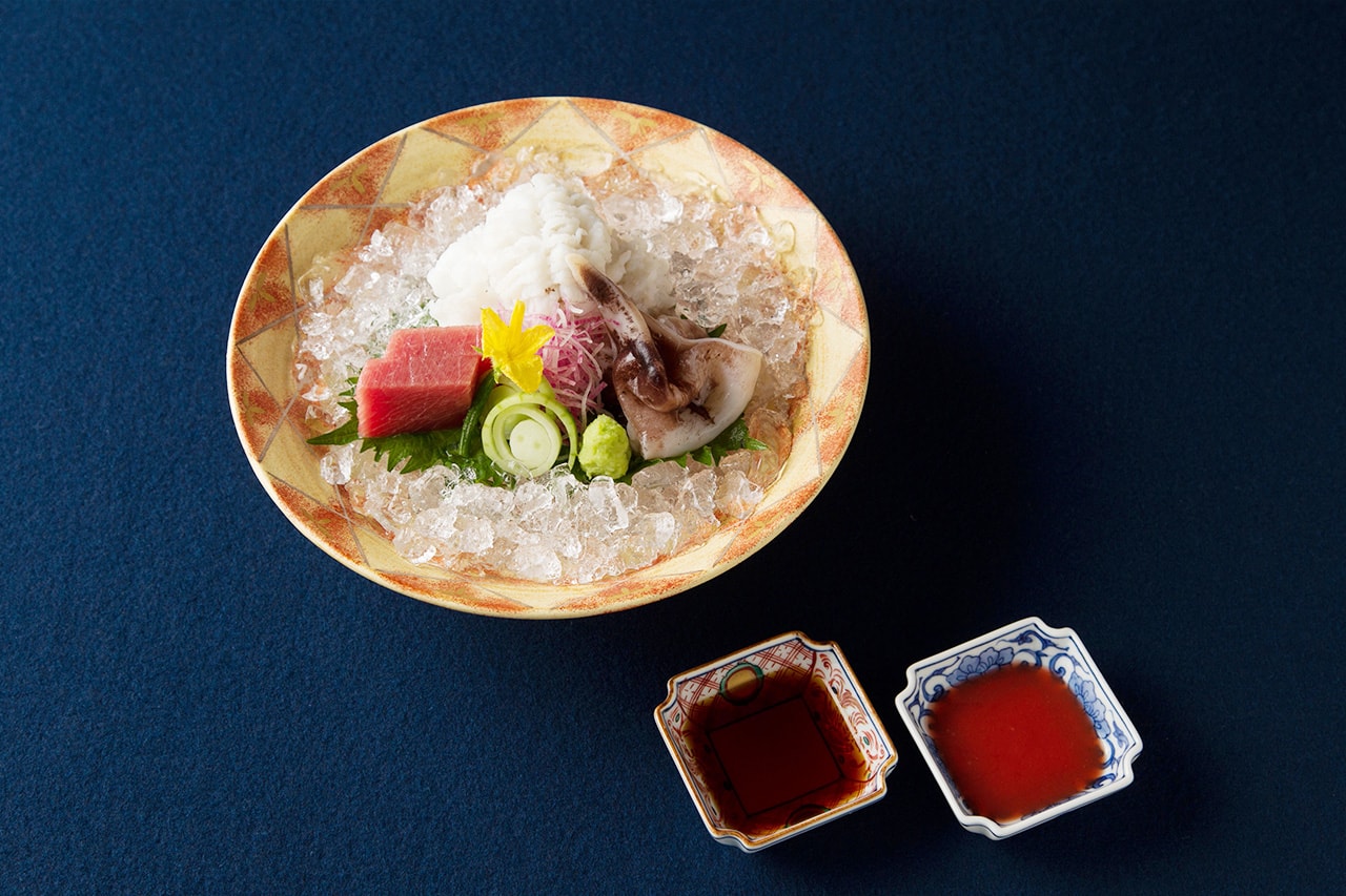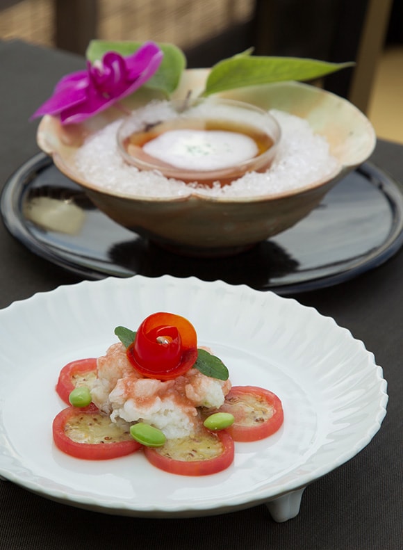 月ごと年ごとに献立を変え、常連客も飽きさせない心遣いにも定評がある。中でも八寸は、一品一品丁寧に仕事の施された季節の味覚が色とりどりに並び、質実さと華やかさの同居する「華やか侘び」とでも言うべき風情で訪問者の目を奪う。さらに床席では、香り高い天然鮎を目の前で料理人が焼き上げるという、屋外ならではの遊び心ある趣向も。