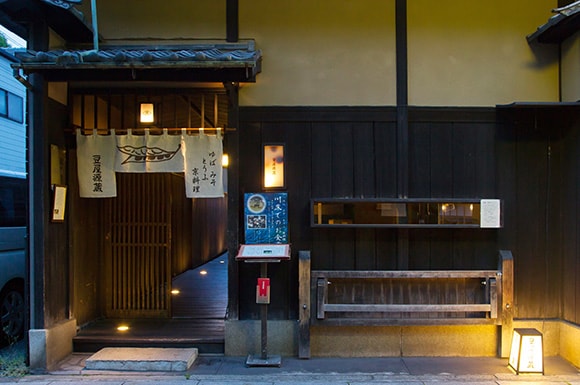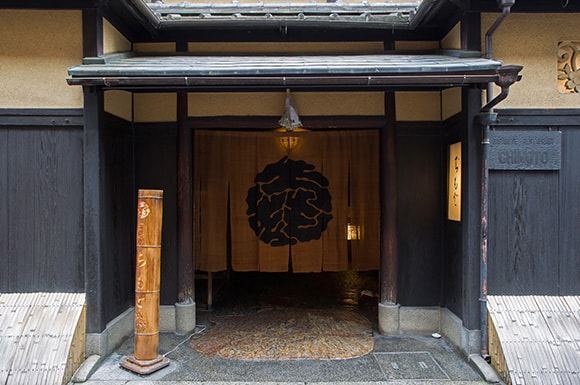 江戸時代の賑わいに思いを馳せつつ四条大橋の西詰に立てば、クラシックな洋館『東華菜館(とうかさいかん)』の右手から始まる控え目な路地、西石垣(さいせき)通が見つかる。石畳に誘われるように歩を進めると、「ちもと」の文字を大胆に意匠化した大きなのれんを掲げる、3階建ての数寄屋建築が目に入る。