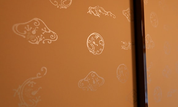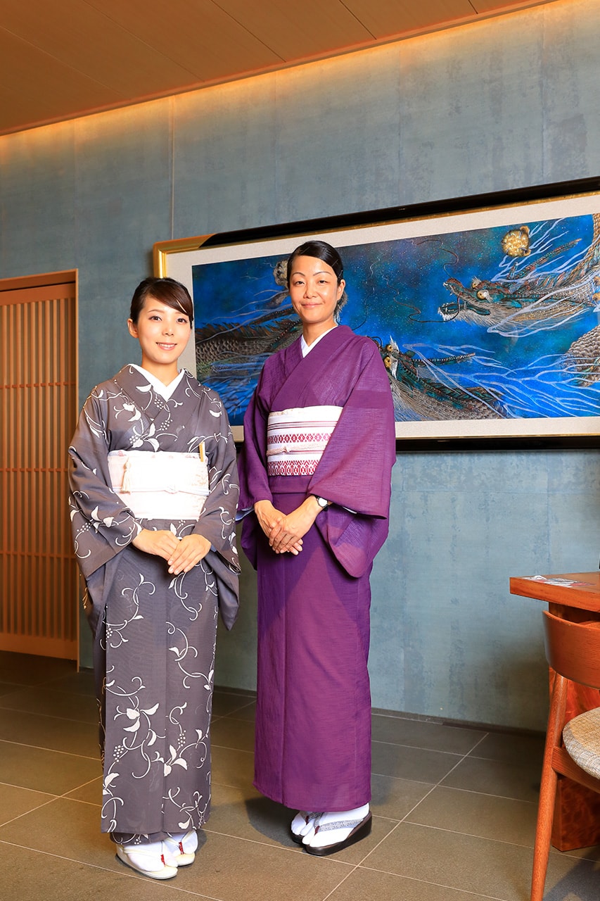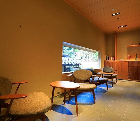 宿の名にちなみ龍を描いたのれんをくぐり、石段を上がって入口へ。コンシェルジュデスクが設けられたレセプション・ロビーには、空を想わせる青の壁にきらめく龍の織絵が。四神相応の考えに則って建造されたという平安京。都の方角を司るとされた四神で、東を護るのが青龍だ。古都の東に位置するこの地で、青き龍が過客を迎えてくれる。