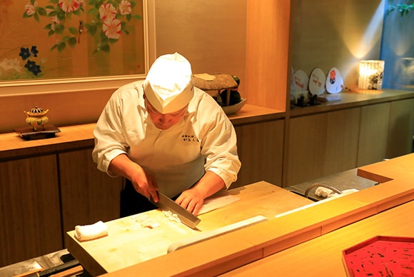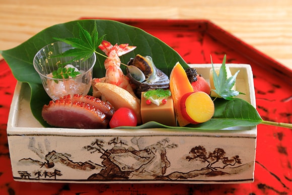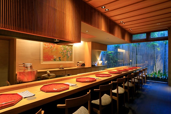 箱皿の中に10品が揃う八寸に箸をのばせば、焼物は熱々、和え物はひんやりと、一品一品が最もおいしい温度で供されていることがわかる。「小さな店だからこそできること。調理場とお客様の距離が近いからこそのおもてなしです」と料理長。また、季節の繊細な移ろいに応じ、メニュー内容は毎日変わる。秋は京都・丹波産の松茸や兵庫や三重県産のふぐ、11月に入れば松葉蟹が愉しめるという。