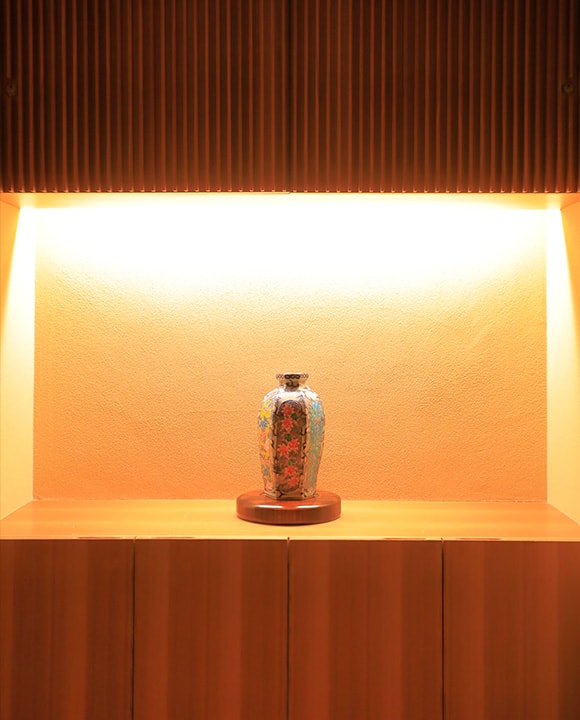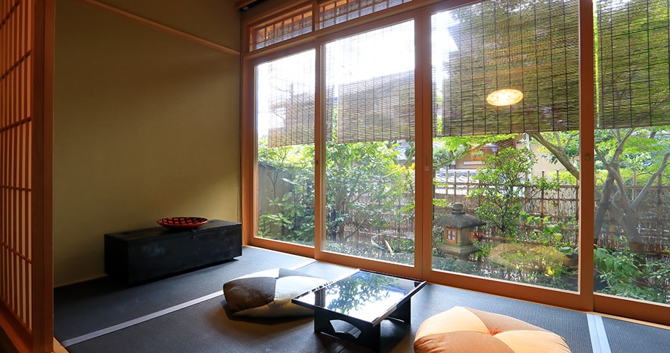 石塀小路の景観に溶け込む外観ながら、室内は一転、モダンな雰囲気を醸す『石塀小路 龍吟』。和と洋のエッセンスが混じる家具やさりげなく設えられた調度品は、どれも主人・畑中氏が厳選したものだ。京唐紙の老舗・丸二の襖紙や、数奇屋建築を手掛ける中村外二工務店が設立した興石の照明といった京都の伝統を生かした品々に加え、パキスタンやペルシャ産の絨毯、清水焼の作家・武内秀峰氏の手になる壷などが部屋に彩りを添えている。
