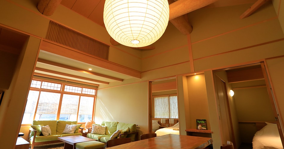 2階は100m2の広さを誇る「幽石(ゆうせき)」の間。中に入れば、見上げる高い天井に露わになった梁。そこからはイサム・ノグチがデザインした大きな球形の和紙照明が下がる。木の温もりに包まれる伸びやかな空間に心身が開放されていくようだ。
