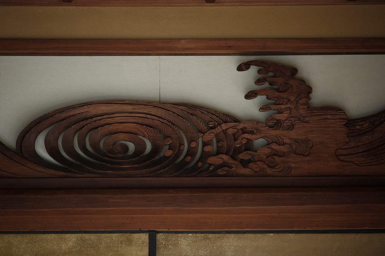 そんな江戸時代の風情を今もたたえる松並木の参道沿いに店を構えるのが、“ゆどうふ”の名店『南禅寺 順正』だ。提灯のかかった小さな門をくぐると、正面に見えるのが、国の登録有形文化財であり店名の由来ともなった「順正書院」である。この書院は、かつて江戸末期の蘭学医・新宮凉庭(しんぐうりょうてい)が開いた学問所であったもの。現在は4部屋のみの客室に改装されている。医学講義を行ったと伝わる「上段の間」は、京都御所の障壁画も手がけた江戸期の絵師・原在中(はらざいちゅう)の襖絵《雪松図襖》や波をかたどった欄間(らんま)などが当時のまま残る部屋として、人気を集める。
