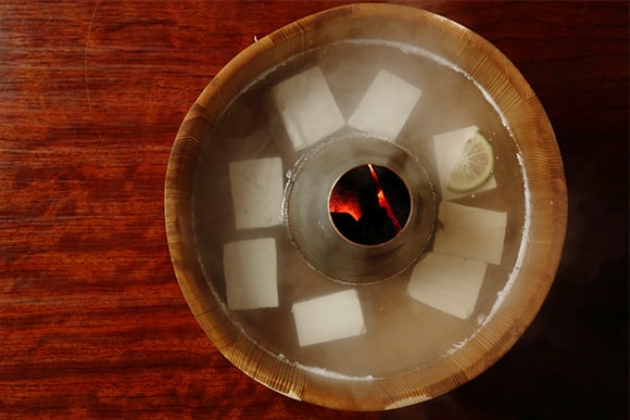 中央に炭が入った桶のフタを開けると、湯気が立ち上り、昆布でとった出汁の中で純白の豆腐がゆらり。「ゆどうふは火加減がなにより大切。内側がほんのりぬくいぐらいで、豆腐本来のおいしさを楽しんでいただけたら」と語るのは店長・浅野聖史氏。絶妙な火加減で供される“ゆどうふ”は、木綿豆腐ながら絹ごしのようになめらかな舌ざわり。大豆の風味とコクが品よく主張しながら、後味はあくまであっさりだ。