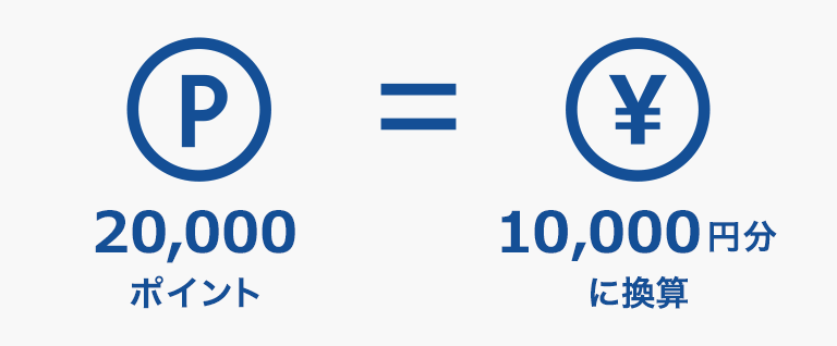 20,000ポイント = 10,000円単位で後日キャッシュバックできます。200,000ポイントから20,000ポイント単位で交換できます。