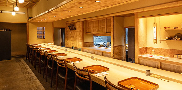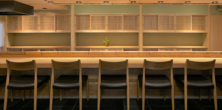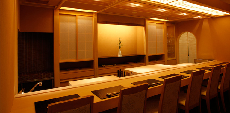 東京ミッドタウン日比谷三階に構えるこちらの店舗は、カウンターやテーブル席、お茶室を設えた落ち着いた空間です。