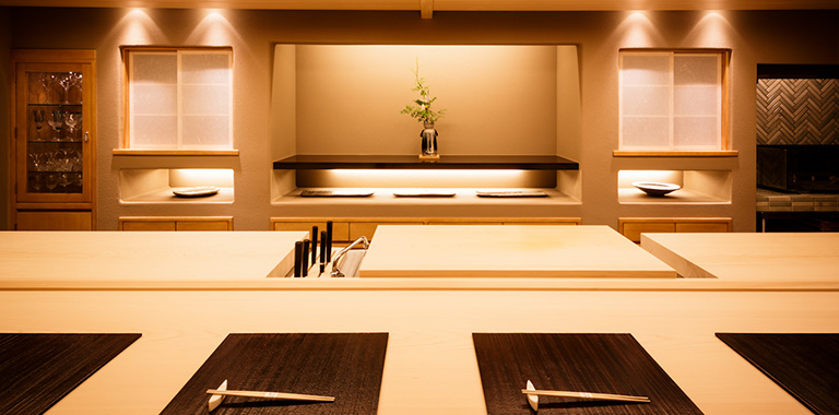 店に入った瞬間から、和の美学が貫かれた空間、空気感、丁寧なおもてなしで皆様を特別な和の世界へと導きます。奥田氏による美しい料理の数々で、日常を忘れ、移ろいゆく四季、和の真髄をぜひご堪能ください。