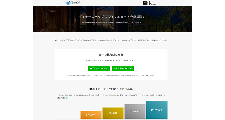 | キャンペーン特典 | キャンペーン専用サイトからのエントリーで一休プレミアサービスの最上級ステージ「ダイヤモンド会員」のサービスを、一休.comのご利用状況に関わらずご利用いただけます。