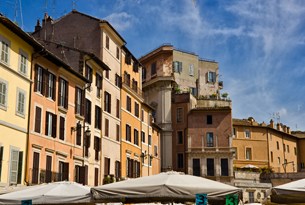 この地にあった「花畑」に名前が由来するカンポ・デ・フィオーリ広場は、街歩きやいろいろな買い物が楽しめる広場です。朝には市が立ち、新鮮な食品や雑貨などを求める人々で賑わいます。広場の中央にあるマントで頭をすっぽり覆った哲学者ジョルダーノ・ブルーノの像の写真を撮るのもよいでしょう。
