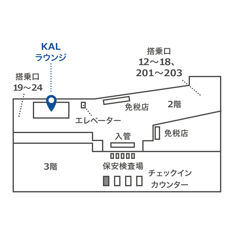 | 所在地 | セキュリティチェック後。国際線出発エリア。3rd Floorの出入国審査後、ゲート19付近のエレベーターで2nd Floorまで下り、ラウンジの標識に従ってお進みください。 |