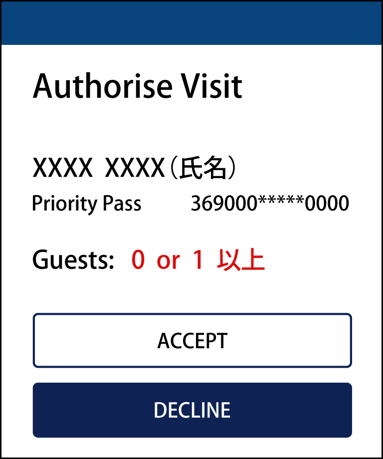 空港ラウンジのスタッフが端末にカードを差し込み後、左図のような画面を提示します。「Guests」の数字をご確認ください。