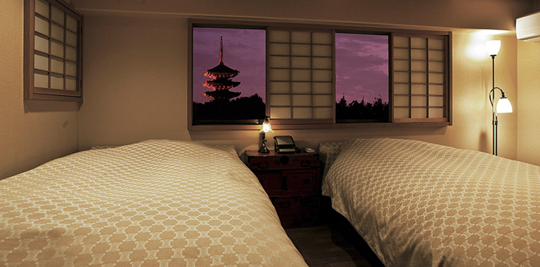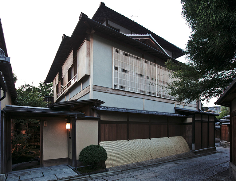 八坂の塔や清水寺も望める木造三階建は、京都の寺社仏閣を手掛けた棟梁によるもの。
