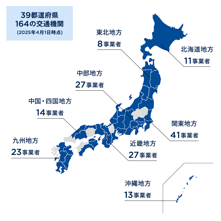 現在、39都道府県164の交通機関でタッチ決済ができます。